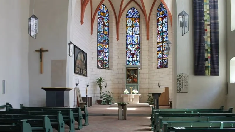 Der lichtdurchflutete Kirchenraum mit seinen hohen Fenstern schafft eine Atmosphäre der Ruhe. Einkehr, Gebet und seelsorgerliche Begleitung stehen im Mittelpunkt.Pilgerstation am Jakobsweg